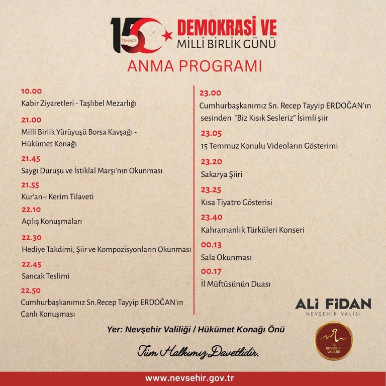 Nveşehir Valiliğince ilimizde düzenlenecek olan 15 Temmuz Demokrat ve Milli Birlik Günü Anma Programının detaylarına anma programı görselinden erişebilirsiniz.